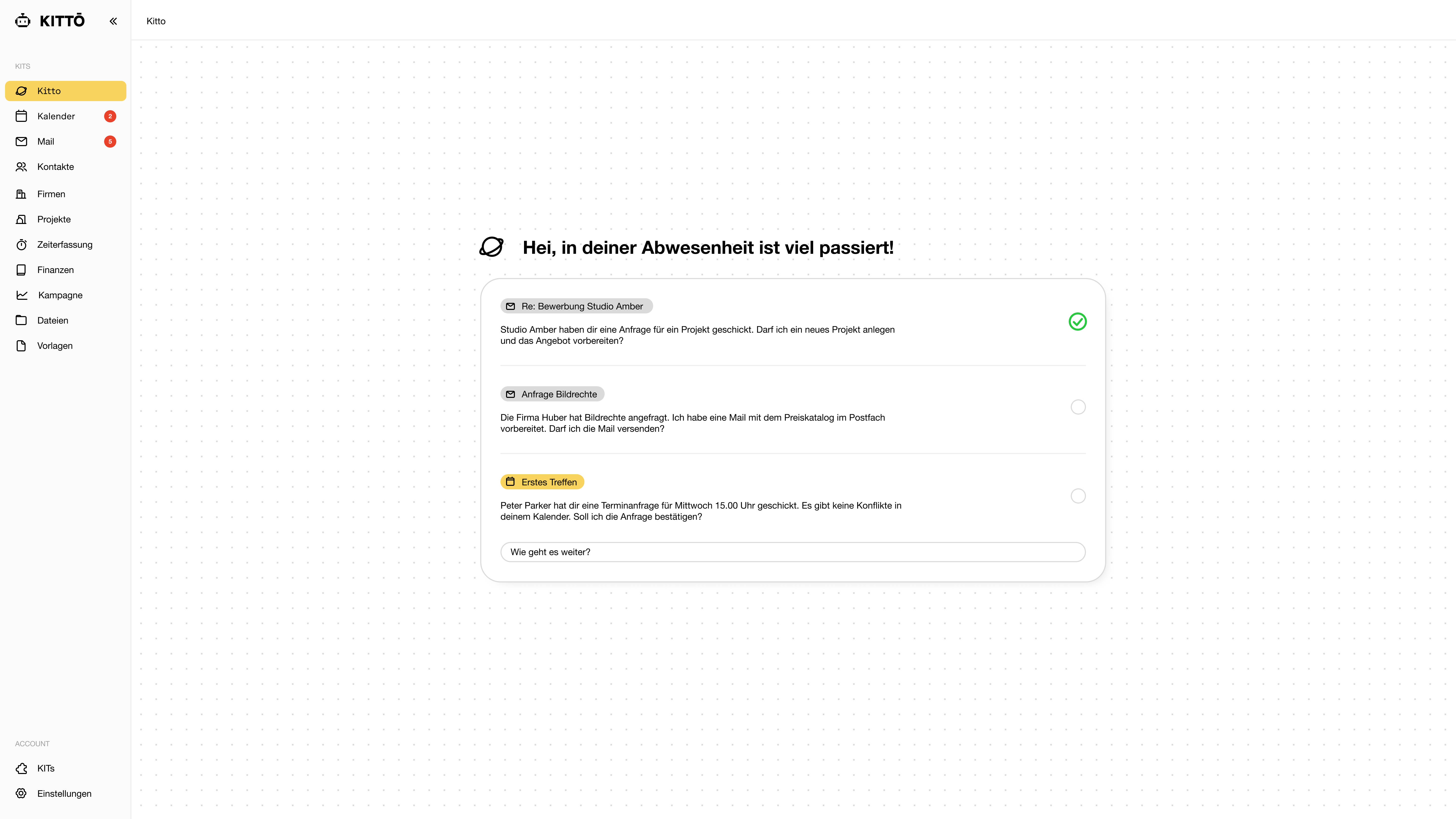 KITTO versteht Mails, Projekte und Kontakte in ihrem Kontext – so intuitiv wie du selbst.